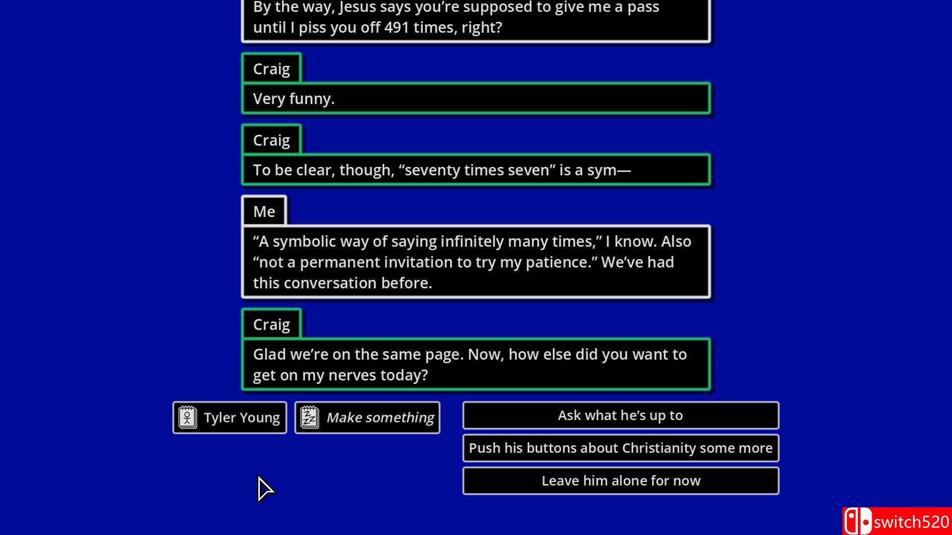 《业余神祇社》是一款冒险解密类(AVG)游戏,《业余神祇社》是一款采用点选式互动方式的故事驱动型文字冒险游戏。游戏以直观的菜单式界面为基础,不需要寻找像素或猜测解析器,而是通过点击高亮词语来推动剧情。玩家需要探索神秘的梦境、隐藏自己的精神状态不被同学发现,同时尽量不要弄坏学校的电脑。switch520